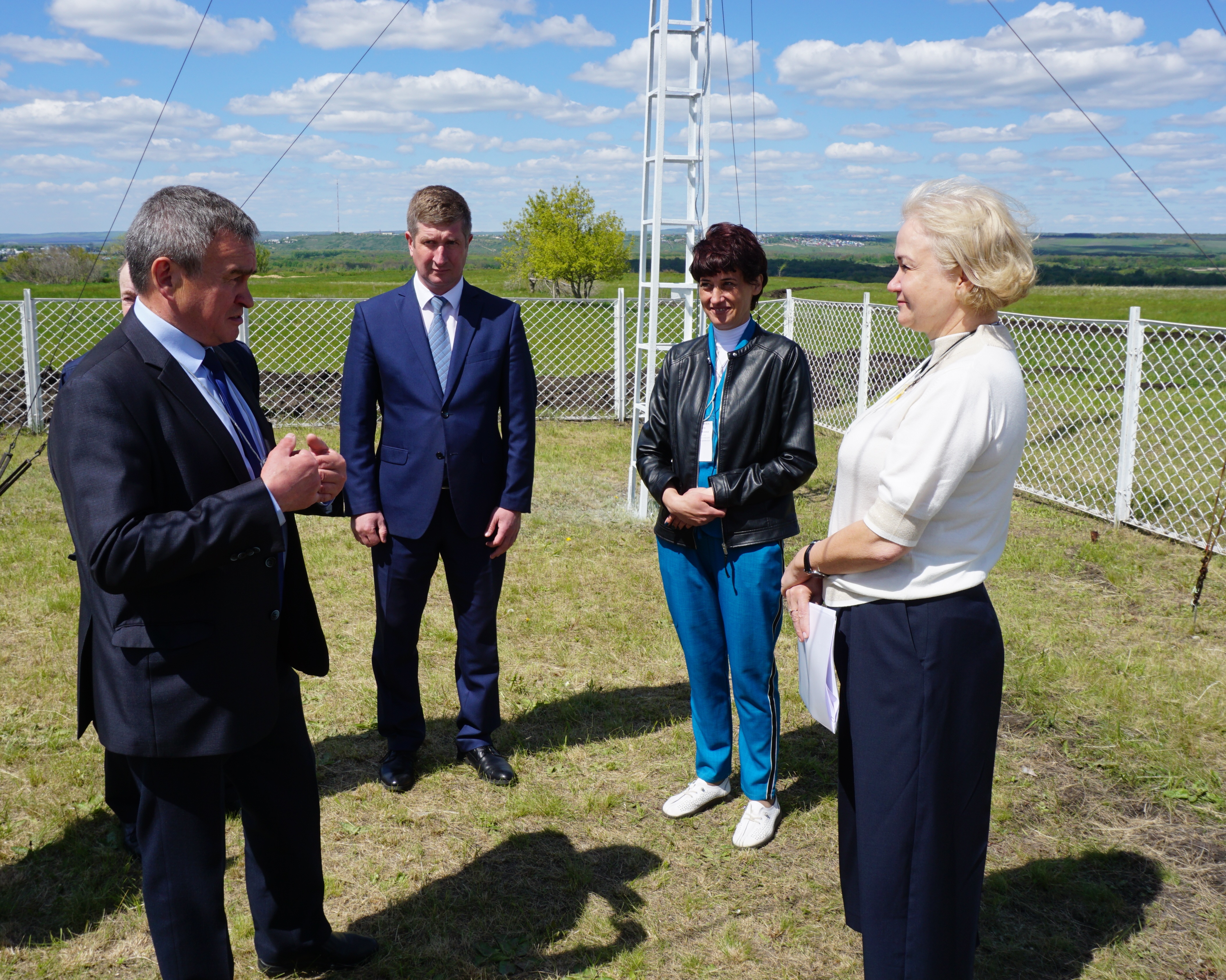 Начальник ФГБУ "Приволжское УГМС" Мингазов А.С. дает пояснения на метеоплощадке. Слева направо: Мингазов А.С., первый заместитель Главы администрации муниципального района Сергиевский Самарской области, начальник М-2 Серноводск Ерохина З.А., заместитель руководителя Росгидромета Радькова Н.В.